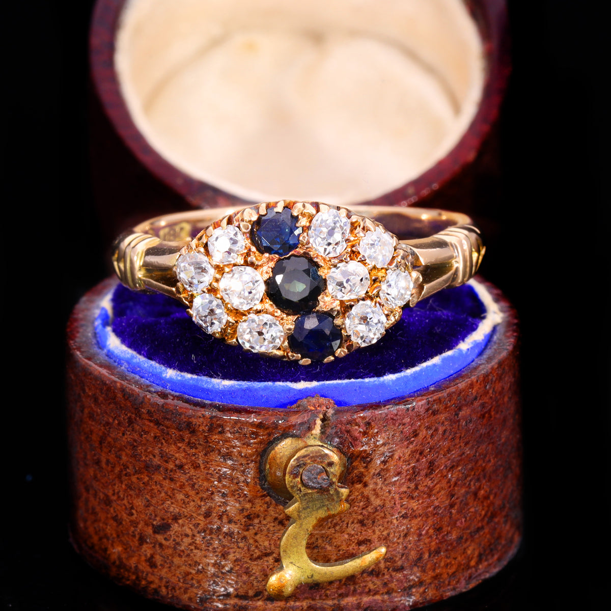 This truly incredible ring, circa 1880-1901, features 3 stunning sapphires of a dark blue and dark, slightly greenish blue colour for a total of 0.39ct. Surrounding them is a host of fabulous old European cut diamonds and one modern brilliant cut diamond, each with incredible lustre and sparkle, boasting antique charm. Each gemstone has been carefully grain and claw set in the low gallery head, leading to split shoulders with scrollwork engraving and a plain band.